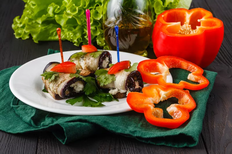 - Сделайте рулетики. Поместите на узкий край баклажановой пластинки 1 ч.л. ореховой пасты и сверните в рулет. Скрепите зубочисткой.