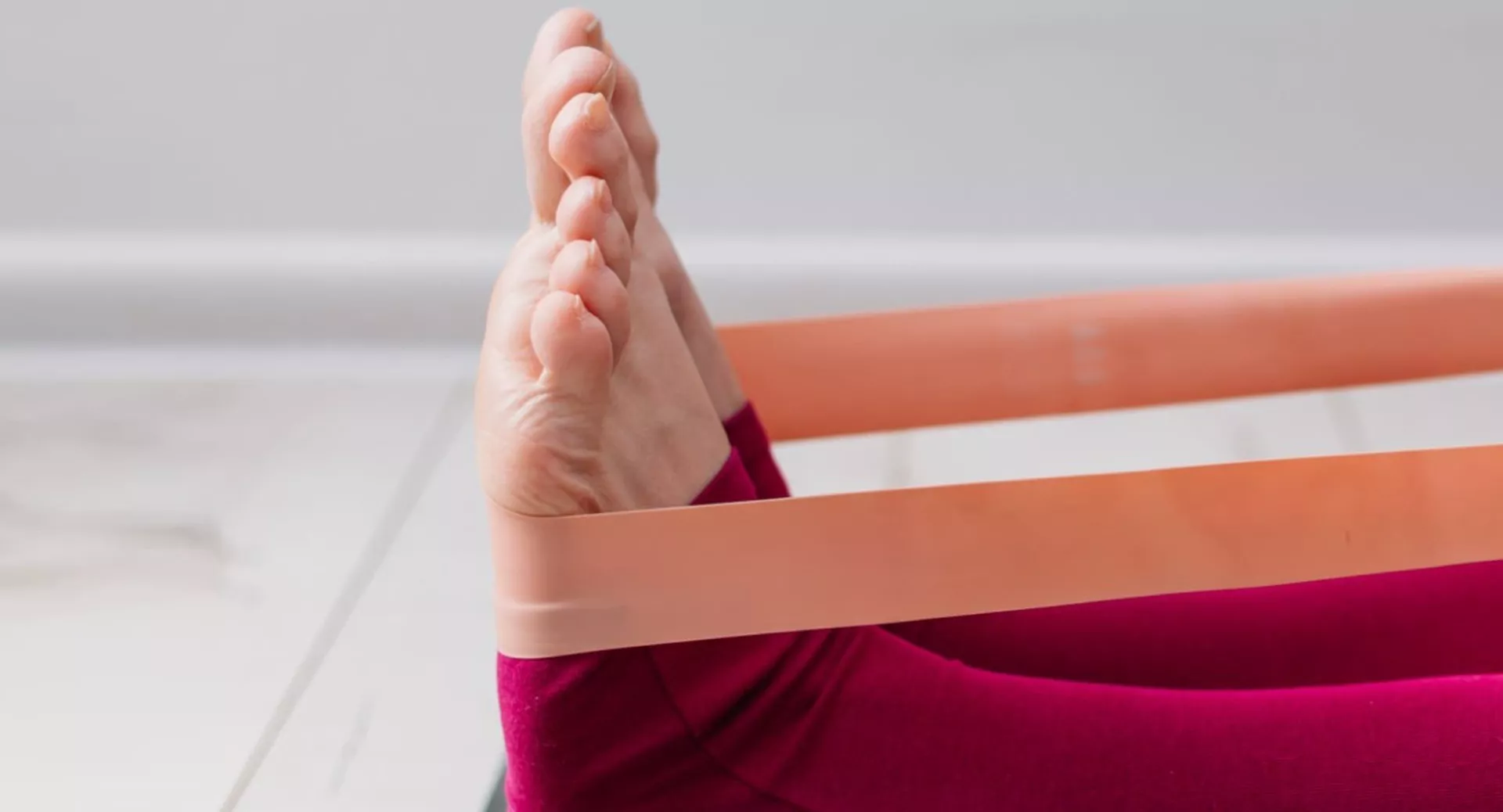 - Заведите резиновую ленту под переднюю стопу и возьмите концы в противоположную руку. Слегка натяните ее.