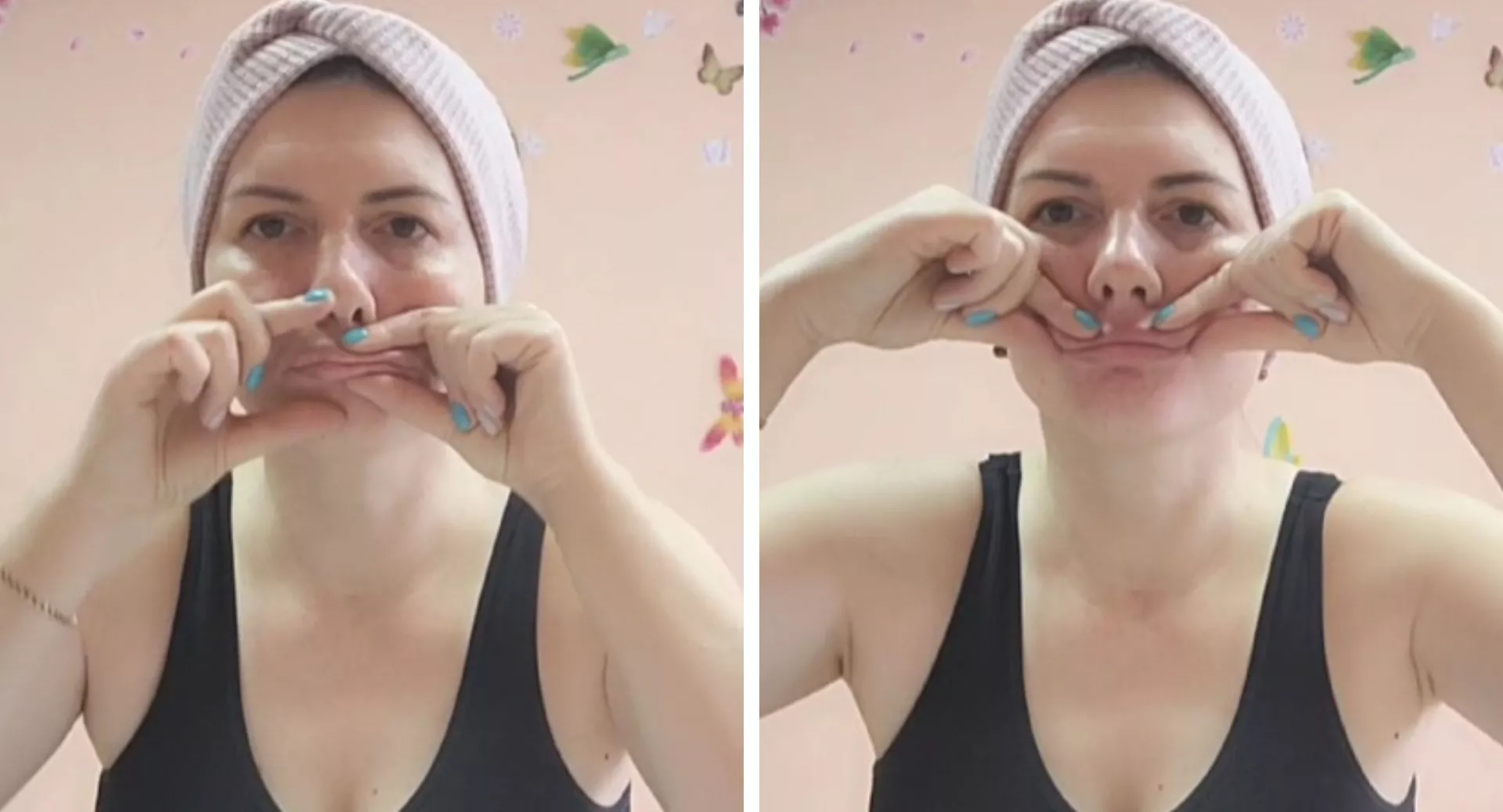 - Помассируйте область губ большим и указательным пальцами обеих рук, захватывая губы от центра и слегка разминая. Двигайтесь от центра к уголкам. В конце приподнимите уголки губ и удерживайте их в течение 5 секунд, как показано на фото».