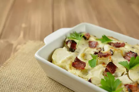 - Выньте картофель из духовки, добавьте бекон и снова поставьте в духовку еще на 10 минут.