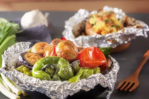 Ингредиенты: 2 ст моркови мини, 2 ст свежей брокколи, 1 большая сладкая картофелина, 1 большая картофелина, 1 зеленый болгарский перец, 1 красный болгарский перец, 1/2 красной луковицы, 6 зубчиков чеснока (измельченных через мясорубку), 5-10 полосок бекона (приготовленных и раскрошенных), 1-2 ст.л. оливкового масла, соль и перец по вкусу, 2 ст.л. сливочного масла (тонко нарезанного).