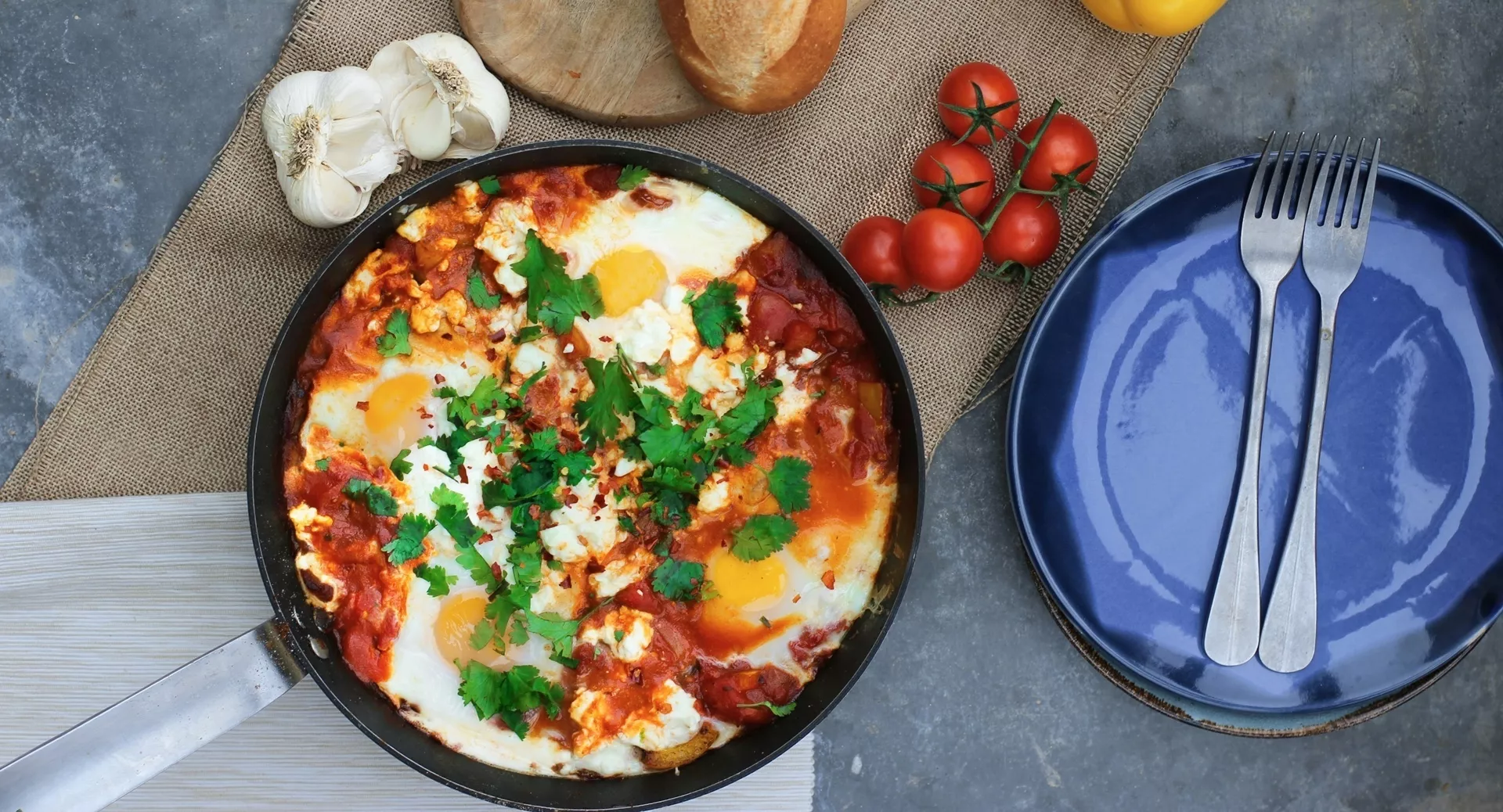 Инструкция. На сковороде с небольшим количеством масла спассеруйте мелко нарезанные лук, помидоры и сладкий перец. Добавьте томатную пасту и тушите до мягкости овощей. Затем в полученную основу аккуратно вбейте четыре яйца, приправьте специями и посолите. Готовьте до состояния, когда белок схватится, а желток останется жидким. Перед подачей посыпьте зеленью.